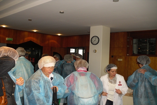 Da in dem Unternehmen strenge hygienische Vorschriften herrschen, müssen alle Besucher Schutzkleidung tragen.
